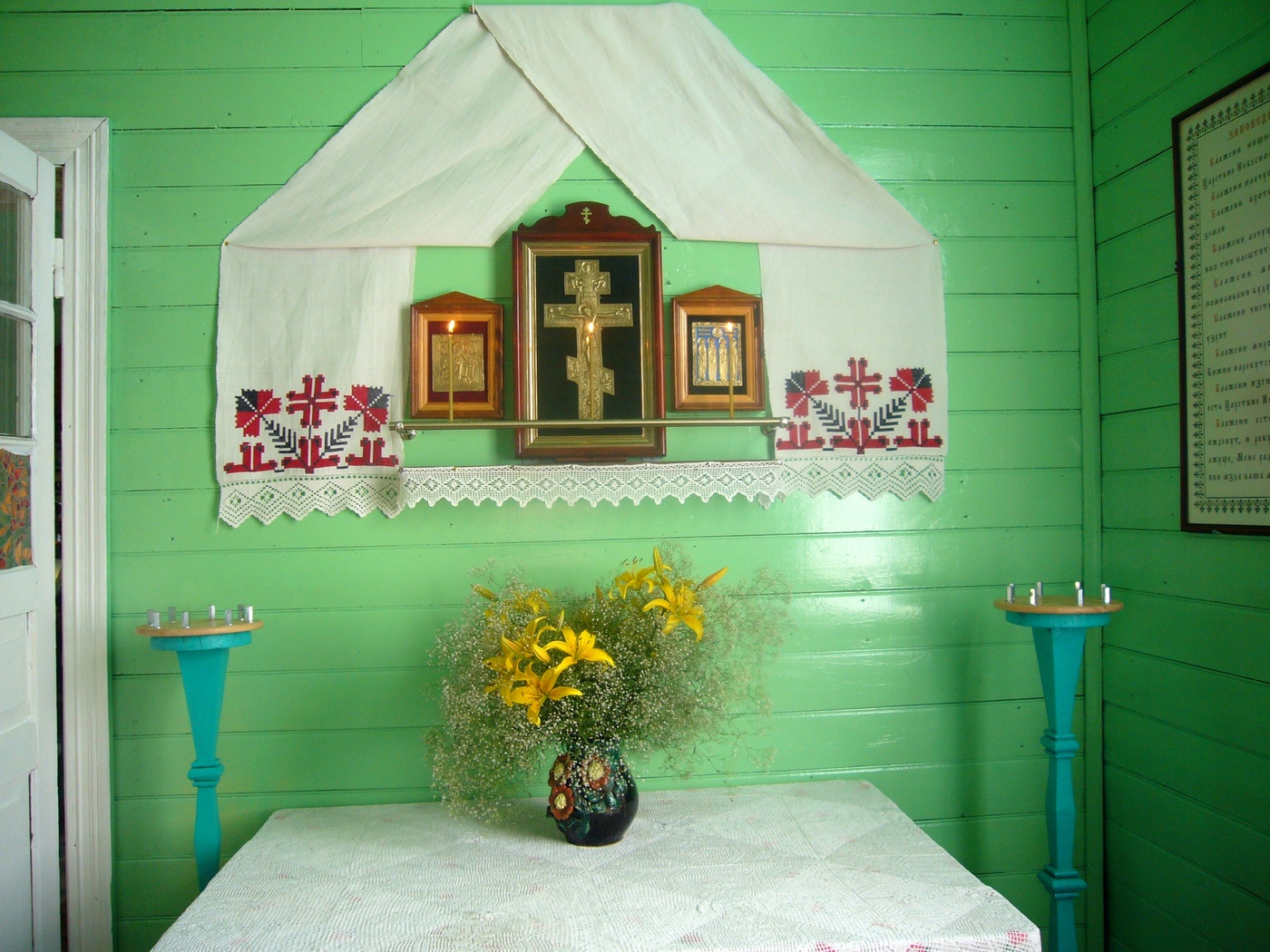 Внутри храма всё празднично и нарядно. Свежая покраска, старинные, богато расшитые рушники, цветы.