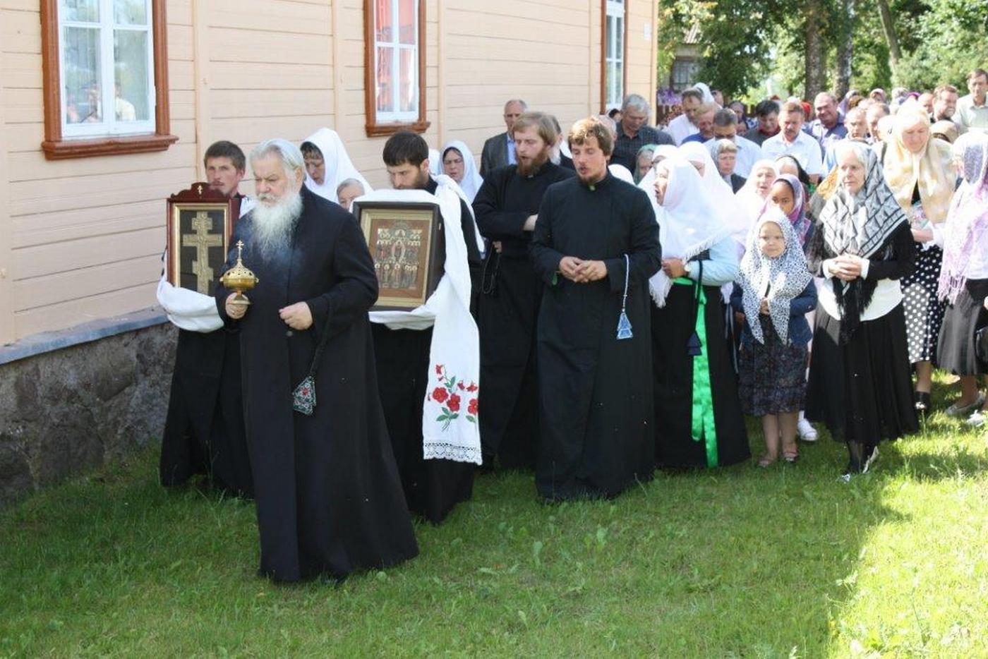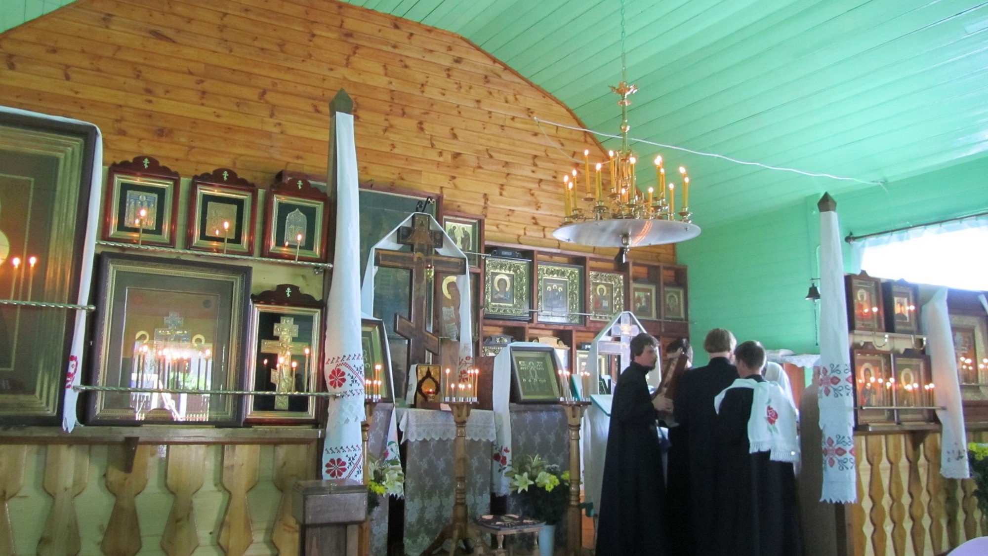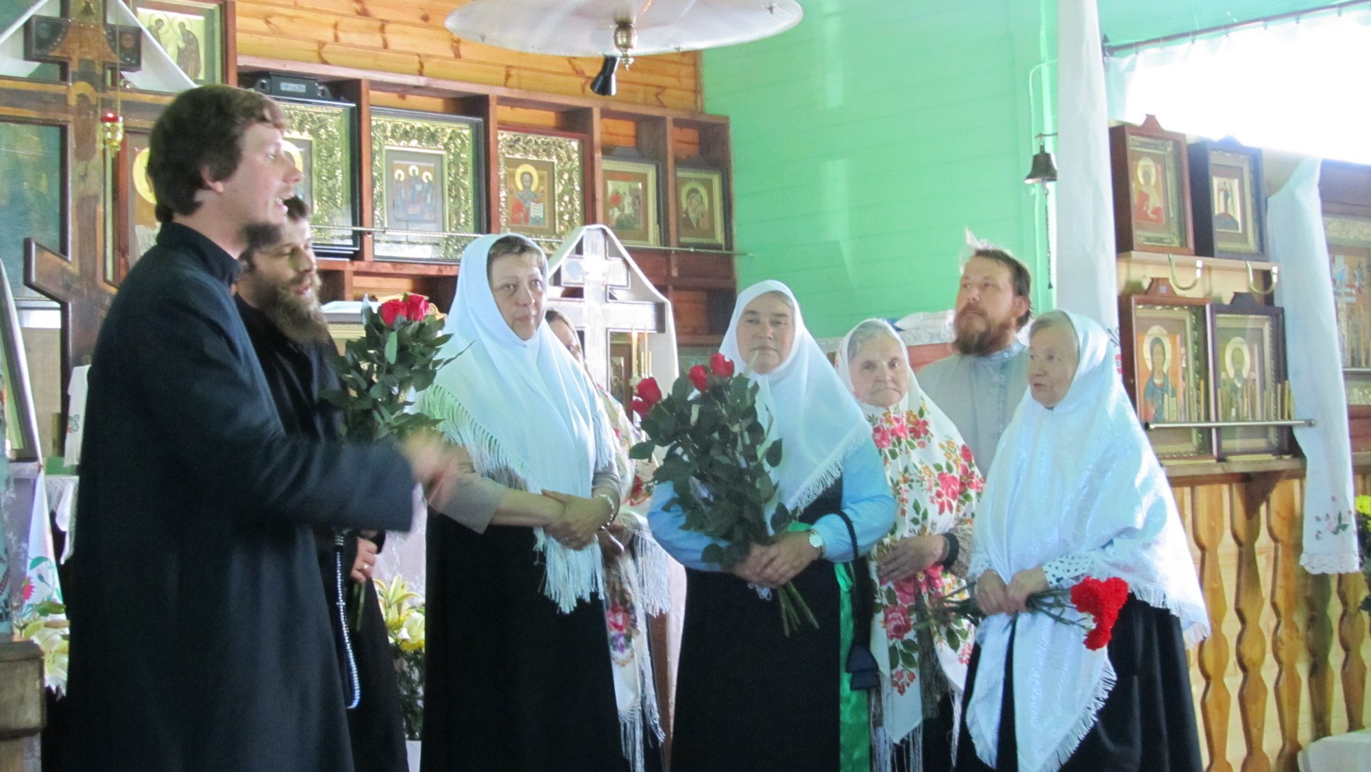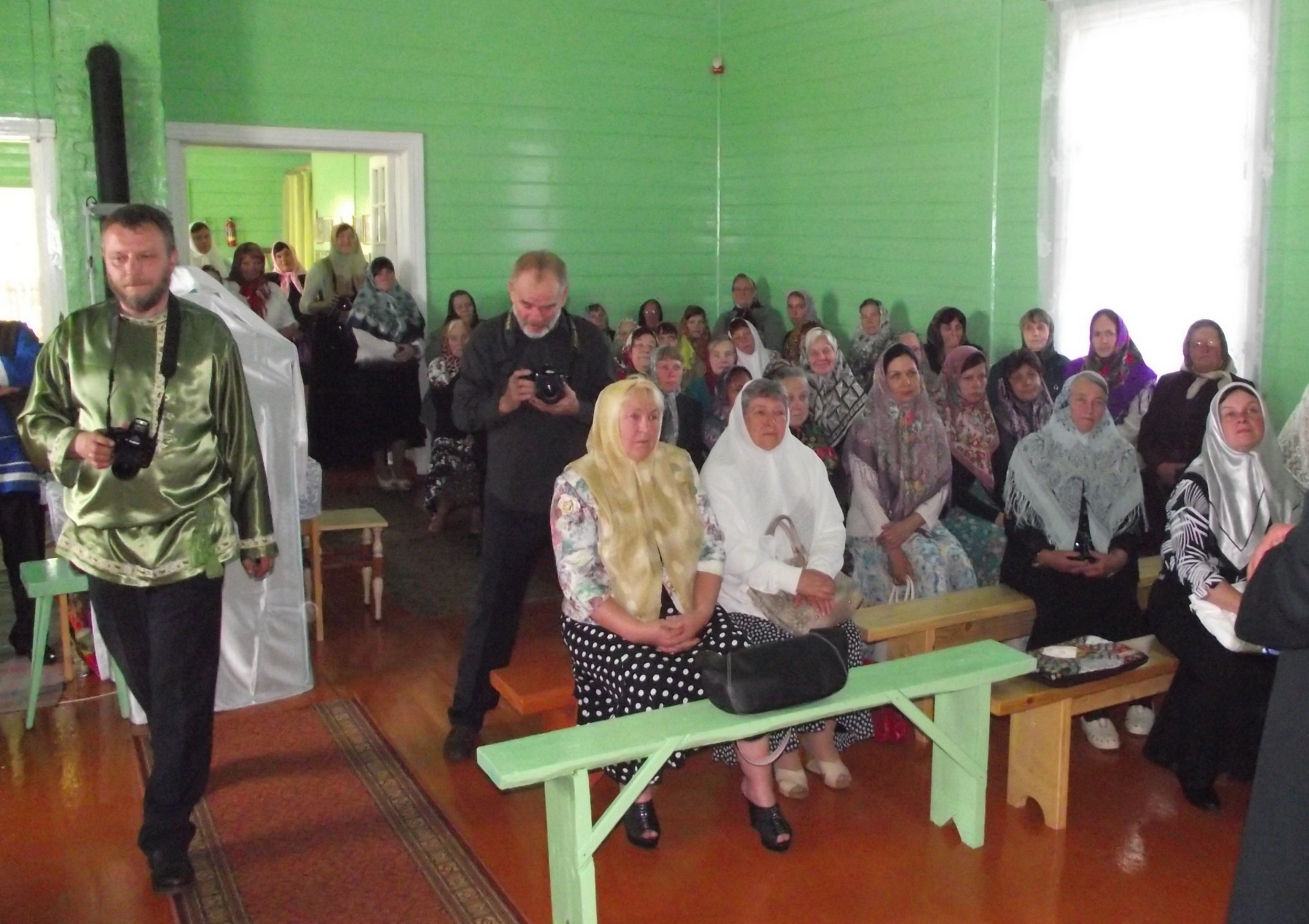Все это время «подтягиваются» и местные жители. Первыми, конечно, самые «молоденькие», — чтобы занять лучшие места и всех и всё увидеть. Затем приходят женщины среднего поколения – хозяйки, накормив семью. У некоторых с собой – и нарядные внуки. Приятно, что среди детей есть и умеющие правильно войти в храм. Помещение моленной заполняется. Женщин, как всегда, больше. Их яркие платы и платочки еще больше усиливают праздничную яркость… Теплые встречи давно не видавшихся знакомых, приглушенный говор…