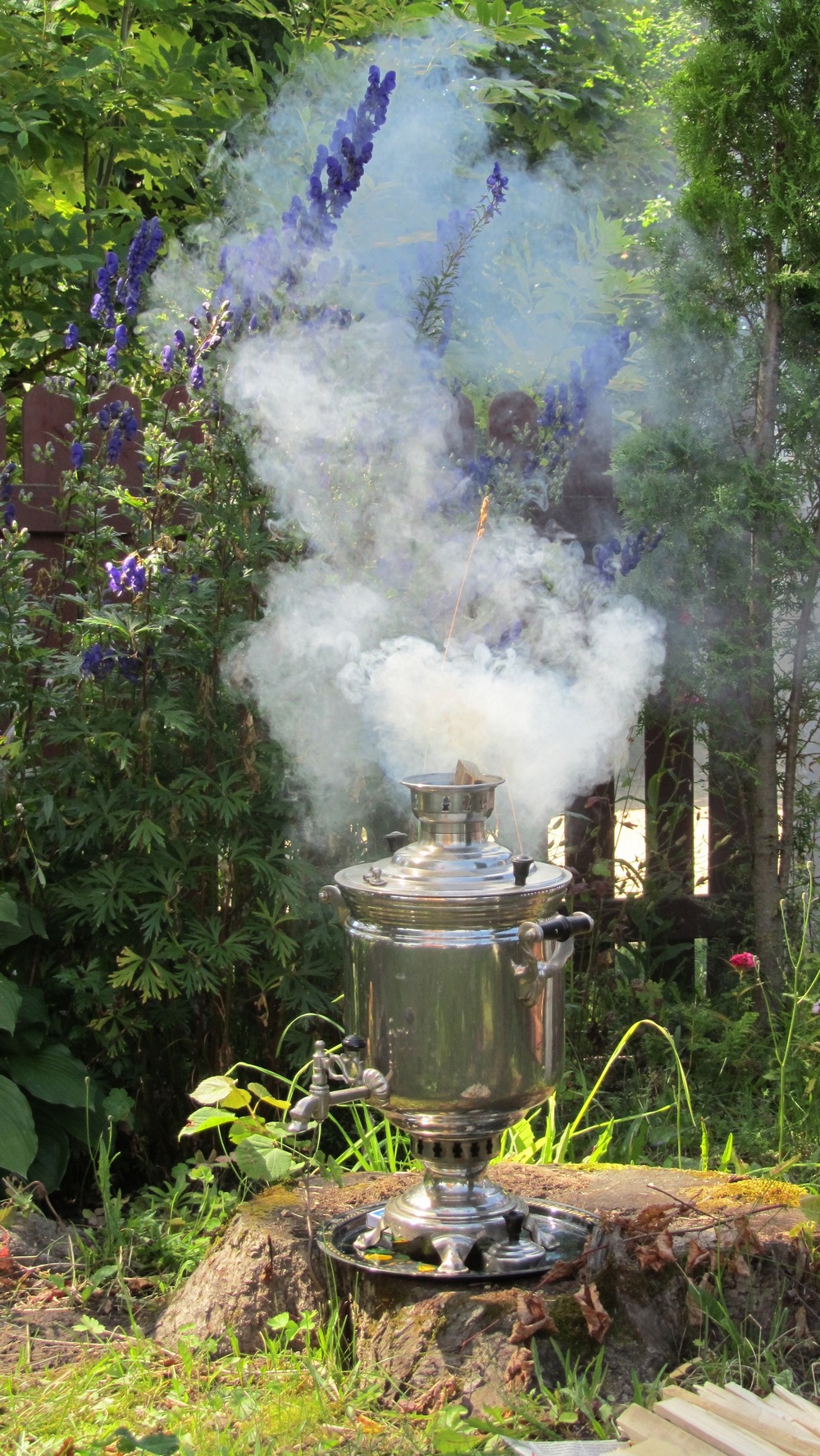 Вслед за этим была еще небольшая братская трапеза за накрытым во дворе столом. Всех восхитил настоящий тульский самовар, стоявший тут же во дворе под «всеми парами». Чай из него показался особенным, заварка — из семи трав. Самовар – семейную реликвию – подарила причетница Домна Григорьевна Крастиня, она же и травы подбирала. Люди снова и снова просили счастливого Георгия Алексеевича повторить звон.