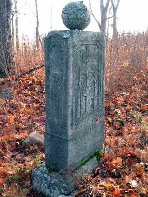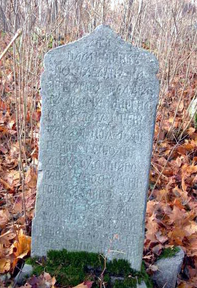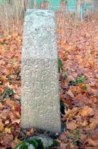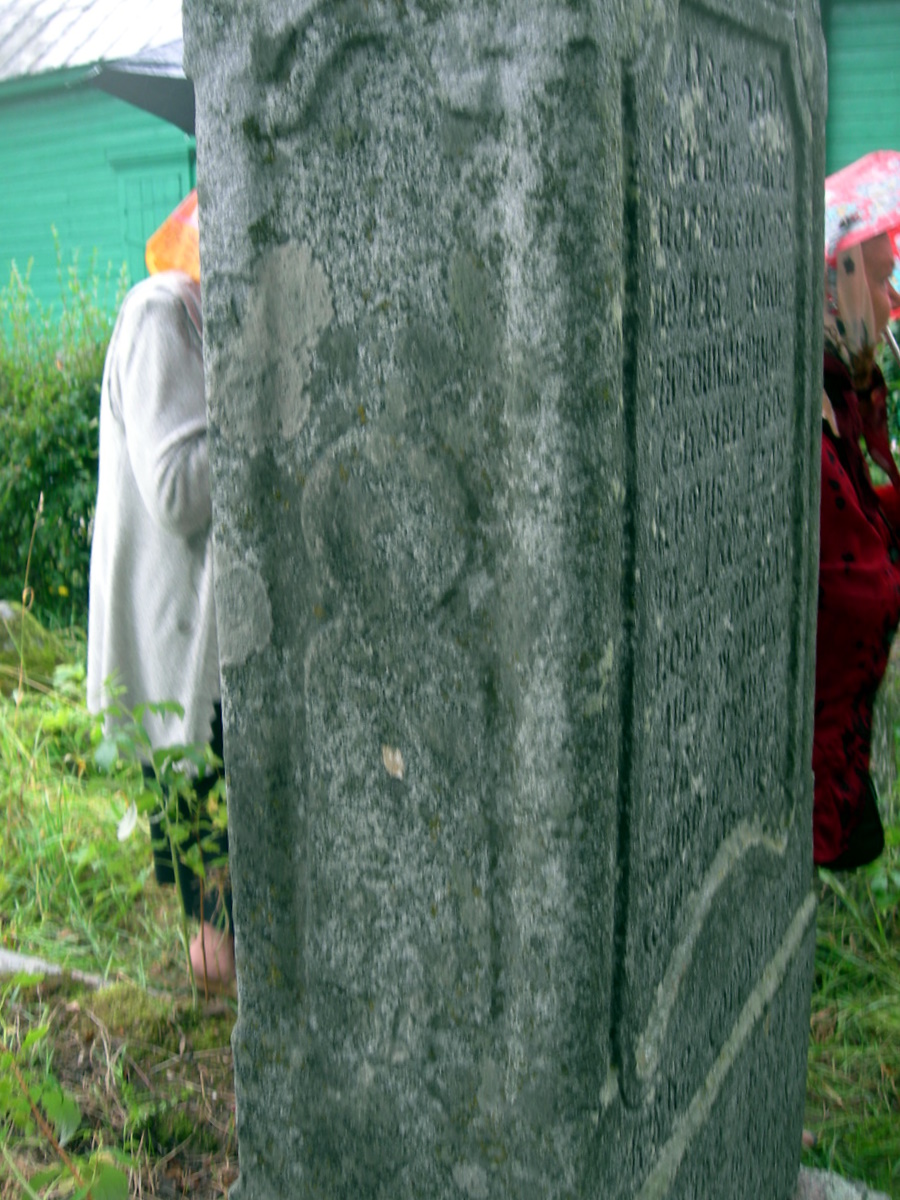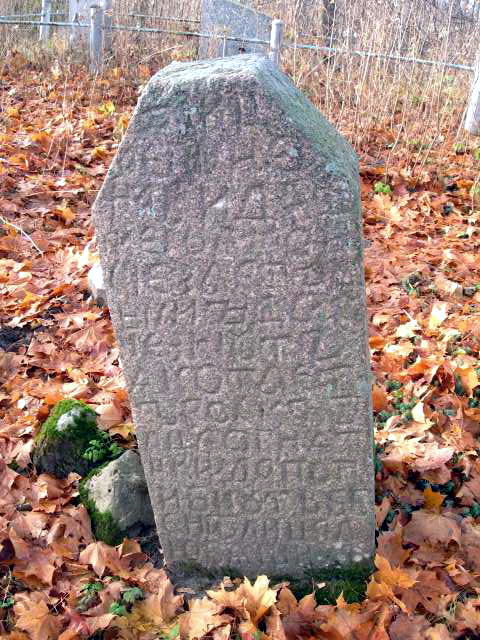 Вблизи от них находится еще одна стела, может, самая массивная на этом кладбище. На боковых гранях особенно заметно, как сильно она расширяется к основанию. Ее правая боковая грань и обратная сторона сплошь покрыта славянской вязью.