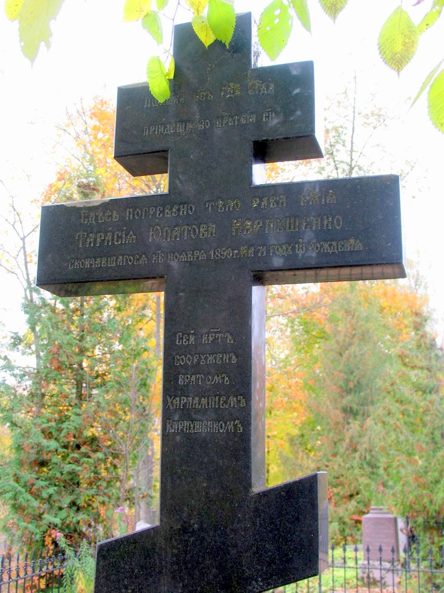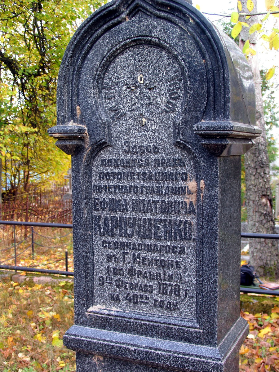 Судя по памятнику, носил при жизни титул Потомственного Почетного Гражданина и Ефим Ипатович Карпушенко. И прах его перевезен с далекого места кончины — из Франции.