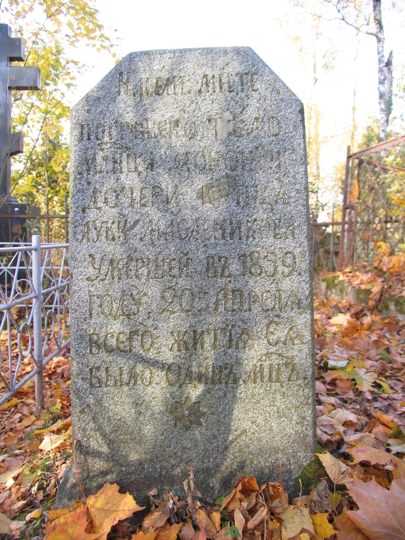 Кладбище было заложено в 1858 году. Самый древний сохранившийся памятник датирован 1859 годом. И все же эта стела Мононии(!), дочери купца Масленикова, не характерна для Резекненского кладбища.