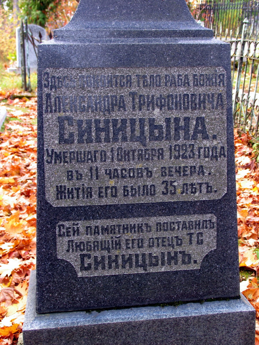 причине ныне на Резекненском староверском кладбище любому посетителю бросаются в глаза в первую очередь пышные ансамбли староверских деятелей времен расцвета общины. Да и размещены они на самых почетных местах, в непосредственной близости от храма. Это несколько ветвей Синицыных и Воробьевых, Трубицины,